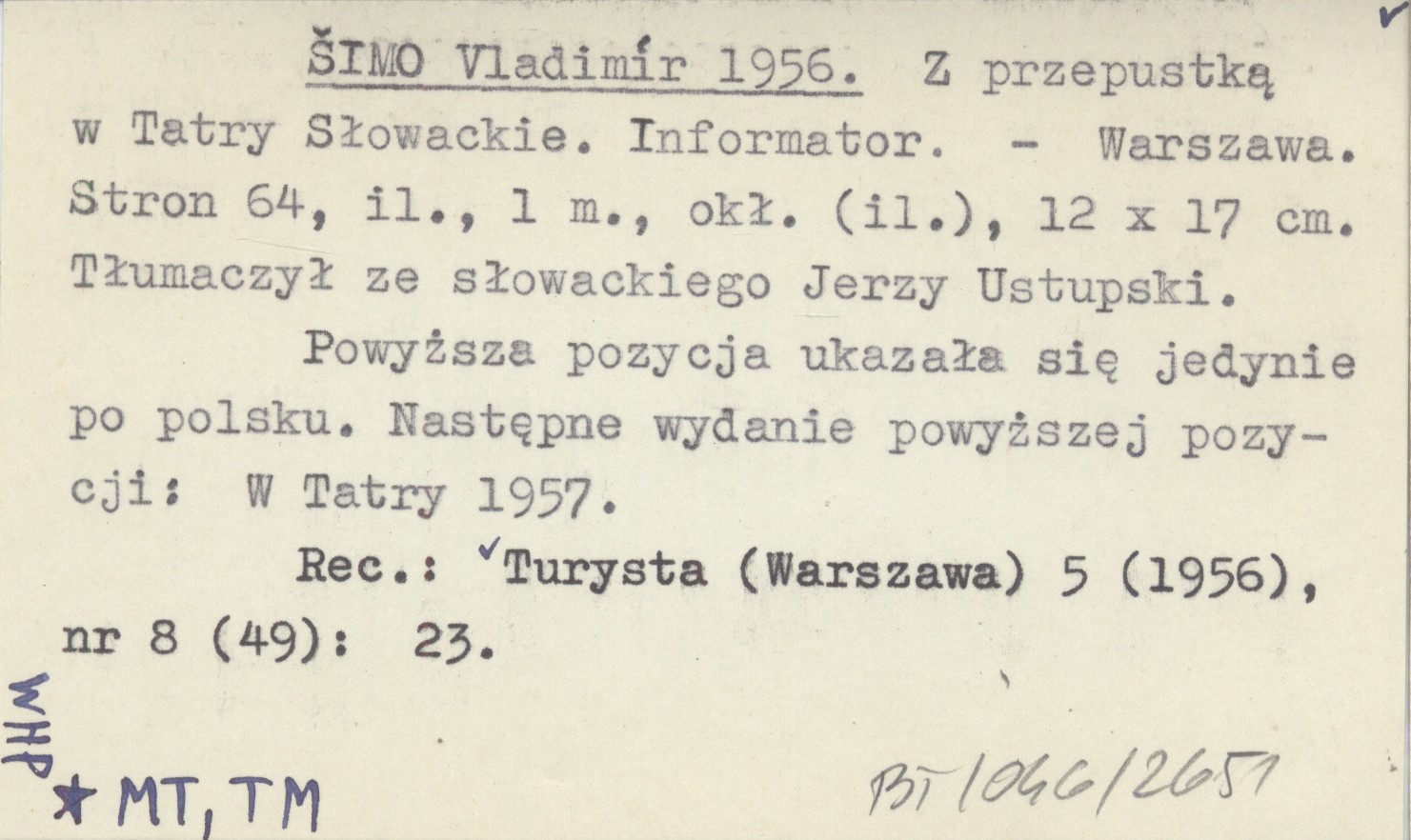 ŠIMO Vladimír 1956 Z przepustką w Tatry Słowackie. Informator.