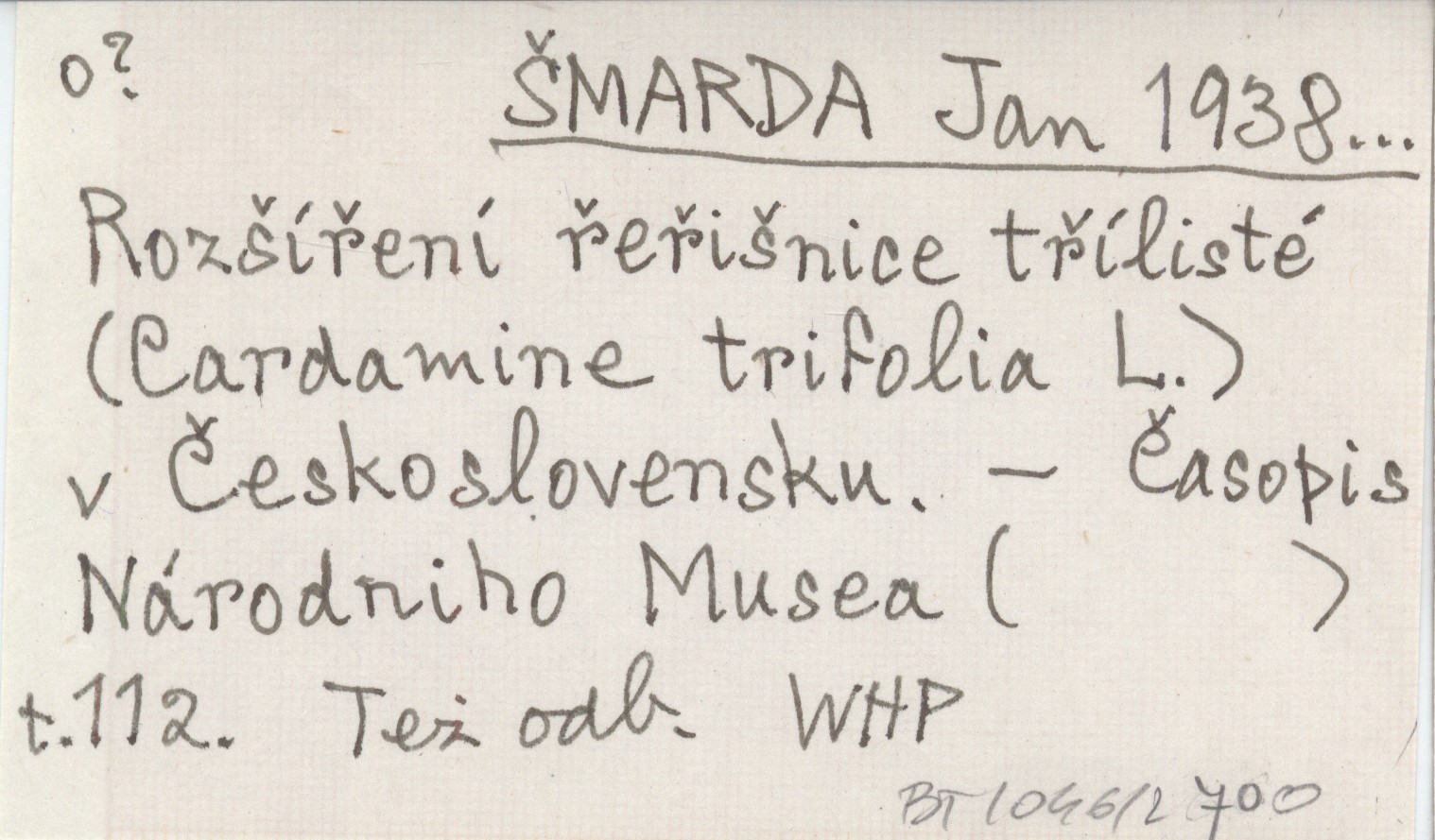 ŠMARDA Jan 1938... Rozšíření řeřišnice třílisté (Cardamine trifolia L.) v Československu.