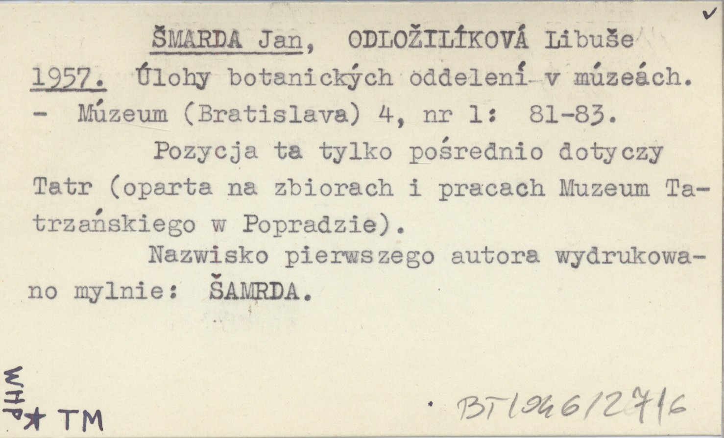 ŠMARDA Jan ODLOŽILÍKOVÁ, Libuše. ; 1957 Úlohy botanických oddelení v múzeách.