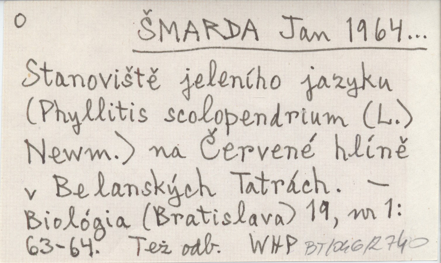 ŠMARDA Jan 1964... Stanoviště jeleního jazyku (Phyllitis scolopendrium (L.) Newm.) na Červené hlíně v Belanských Tatrách.