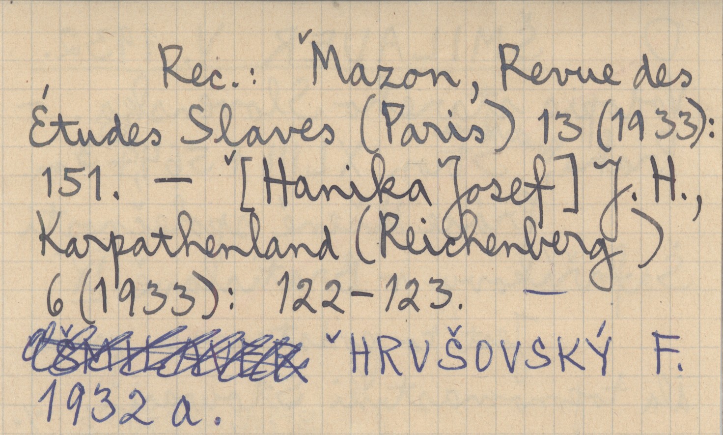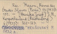 REC: MAZON, Revue des Études Slaves (Paris) 13 (1933): 151 ; [HANIKA Josef] J. H., Karpathenland (Reichenberg) 6 (1933): 122-123 ; HRU©OVSKĘ F. 1932 a ;
