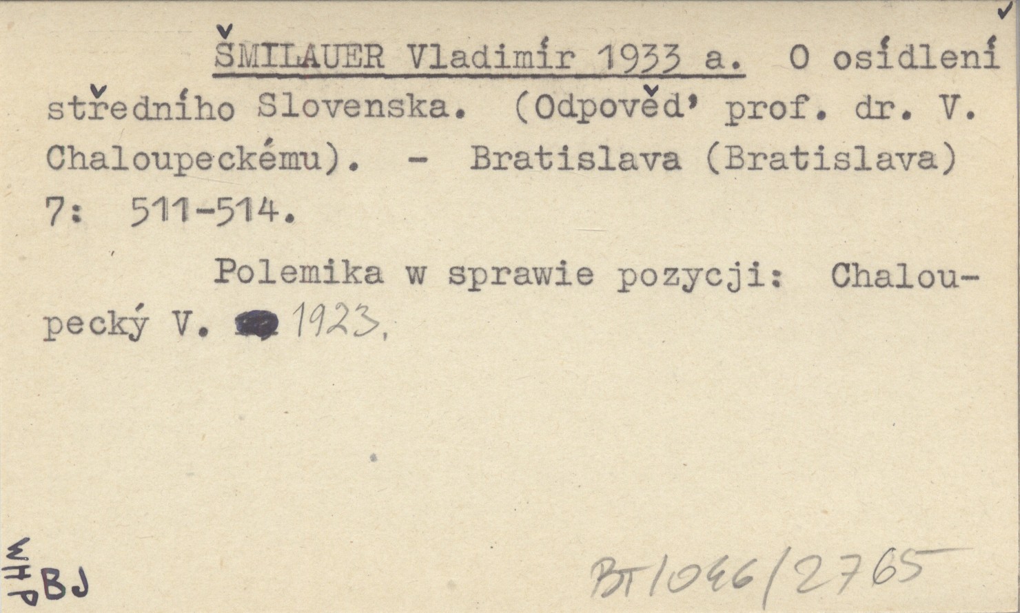 ŠMILAUER Vladimír 1933 a O osídlení středního Slovenska. (Odpověď prof. dr. V. Chaloupeckému).