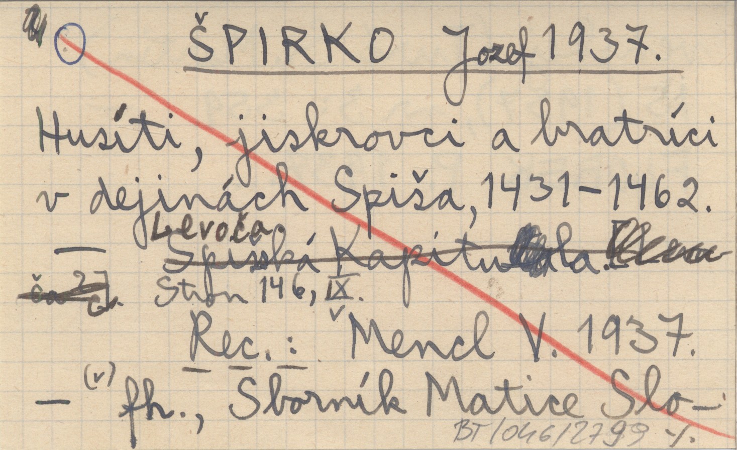 Levoča , 146, IX s. REC: MENCL V. 1937 ; fh., Sborník Matice Slovenskej (Turčiansky Svätý Martin) 15 (1937), nr 3: 359 ; FLOREK P. 1937... ;