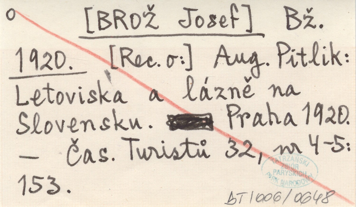 Bž. [BROŽ Josef] 1920 Aug. Pitlik: Letoviska a lázně na Slovensku. Praha 1920.