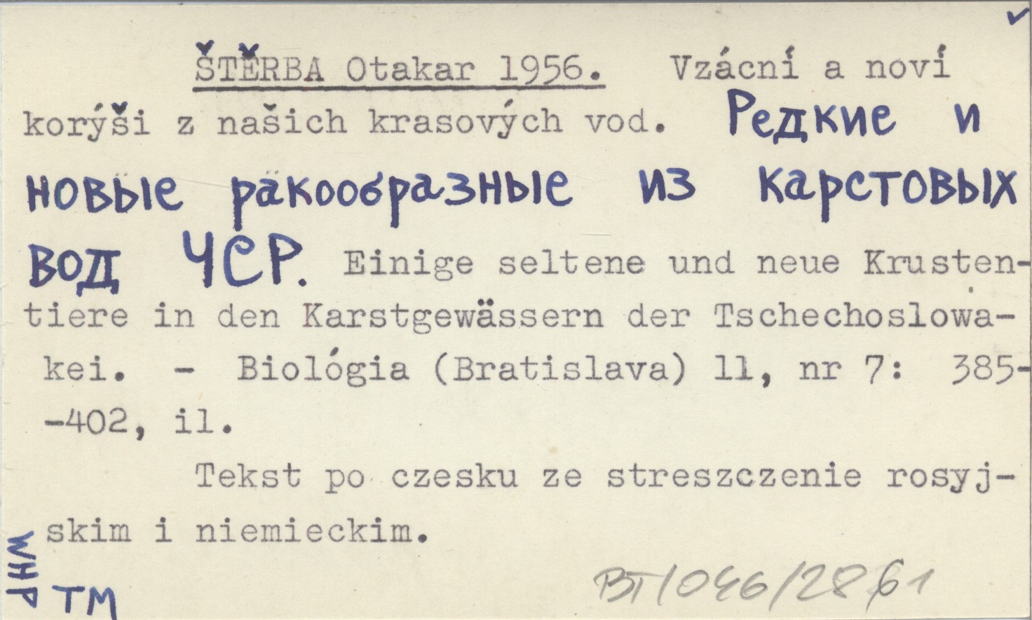 ŠTĚRBA Otakar 1956 Vzácní a noví korýši z našich krasových vod. Redkie i novye rakoobraznye iz karstovych vod ČSR. Einige seltene und neue Krustentiere in den Karstgewässern der Tschechoslowakei.