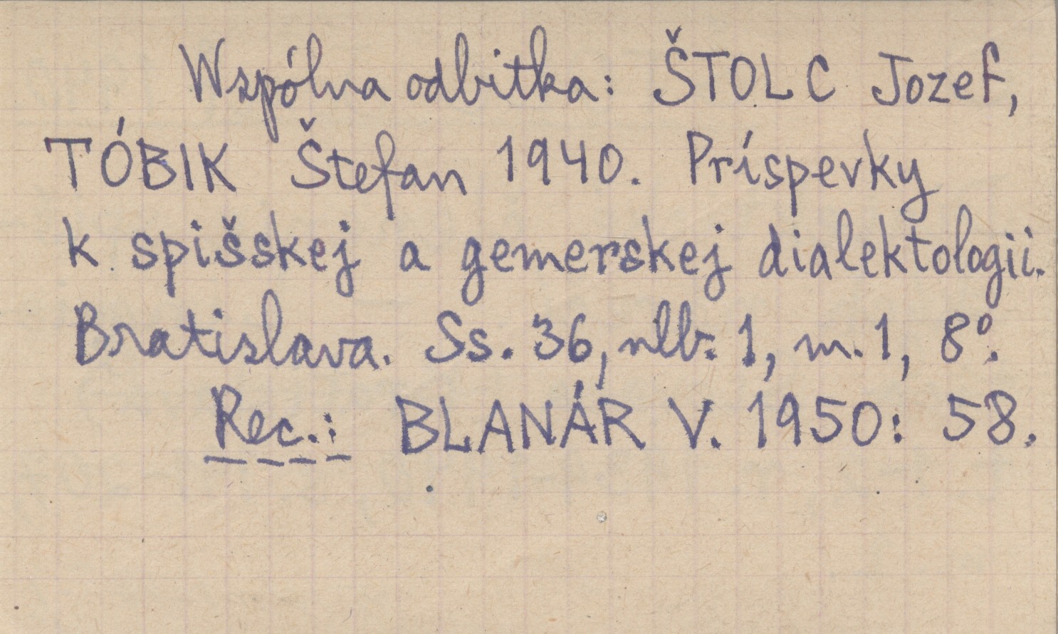 Wspólna odbitka: ©TOLC Jozef, TÓBIK ©tefan 1940. Príspevky k spičskej a gemerskej dialektologii. Bratislava 36, [1] s., 1 mapa, 8°.