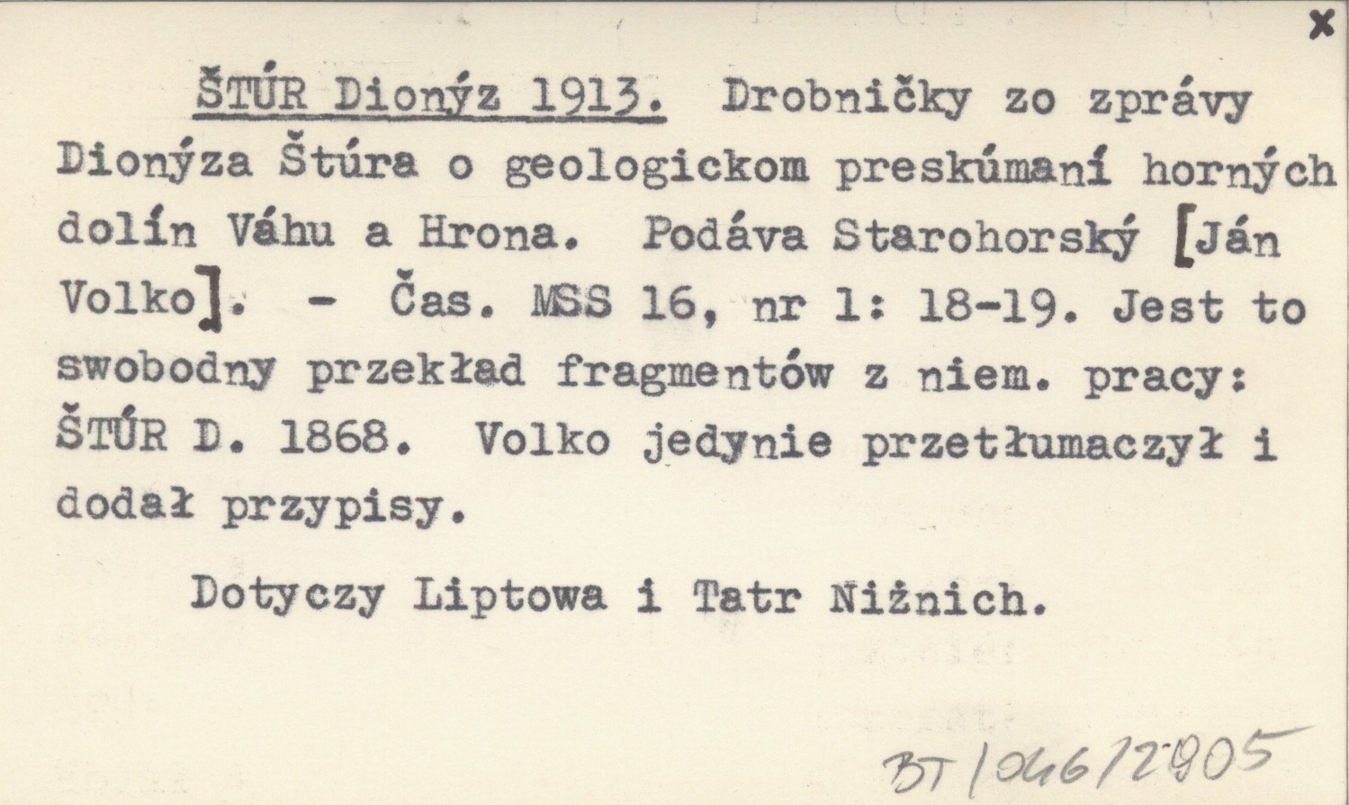 Drobnièky zo zprávy Dionęza ©túra o geologickom preskúmaní hornęch dolín Váhu a Hrona. Podáva Starohorskę [Ján Volko].