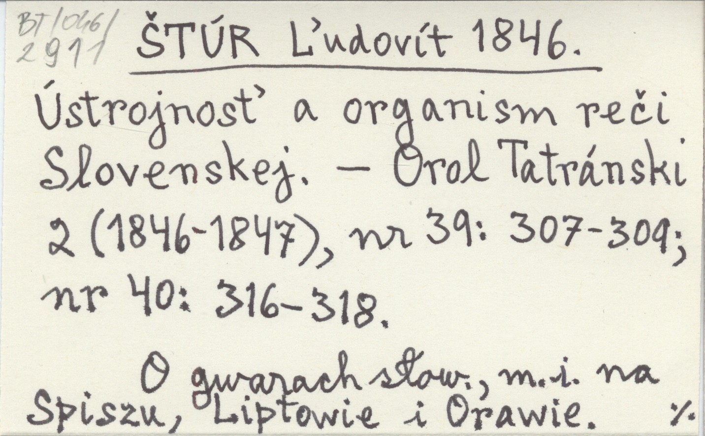 Orol Tatránski, 2 (1846-1847), nr 39: 307-309 ; nr 40: 316-318. O gwarach słowackich, m. in. na Spiszu, Liptowie i Orawie.