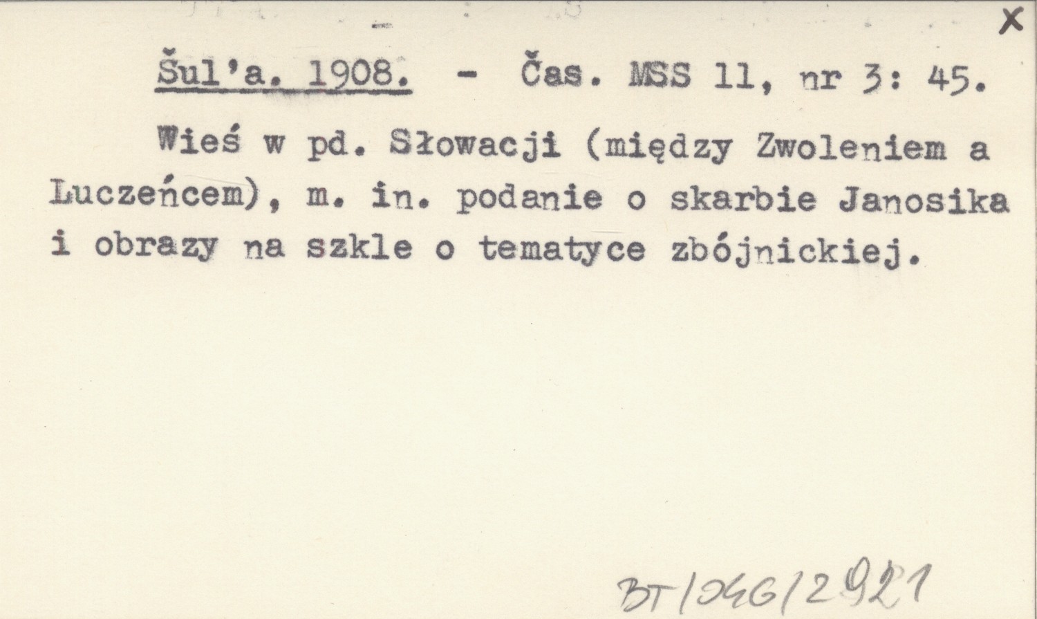 Časopis Muzeálnej Slovenskej Spoločnosti, 11, nr 3: 45. Wieś w pd. Słowacji (między Zwoleniem a Luczeńcem), m. in. podanie o skarbie Janosika i obrazy na szkle o tematyce zbójnickiej.
