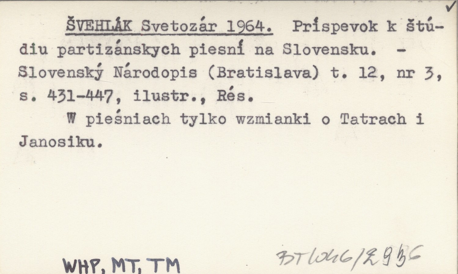 Slovenský Národopis (Bratislava) , T. 12, nr 3: 431-447, il., Rés. W pie¶niach tylko wzmianki o Tatrach i Janosiku.