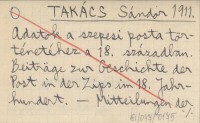 TAKÁCS Sándor 1911 Adatok a szepesi posta történetéhez a 18. században. Beiträge zur Geschichte der Post in der Zips im 18. Jahrhundert.