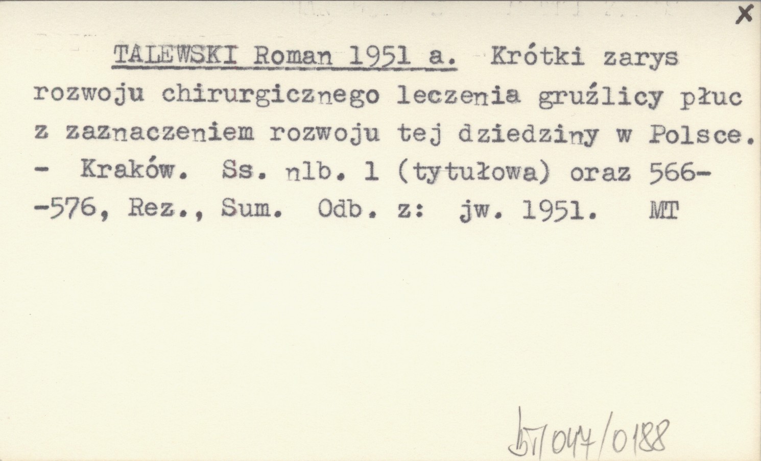 TALEWSKI Roman 1951 a Krótki zarys rozwoju chirurgicznego leczenia gruźlicy płuc z zaznaczeniem rozwoju tej dziedziny w Polsce.