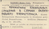 TALEWSKI Roman 1952 Przepalenie zrostów opłucnych w przypadkach odmy dwustronnej. Perežiganie plevral'nych srašenij v slučajach bilaterab'nogo pnevmotoraksa. Closed Intrapleural Pneumonolysis in Bilateral Artificial Pneumothorax.