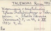 TALEWSKI Roman 1953 Wspomnienie o działalności Tytusa Chałubińskiego w Zakopanem.