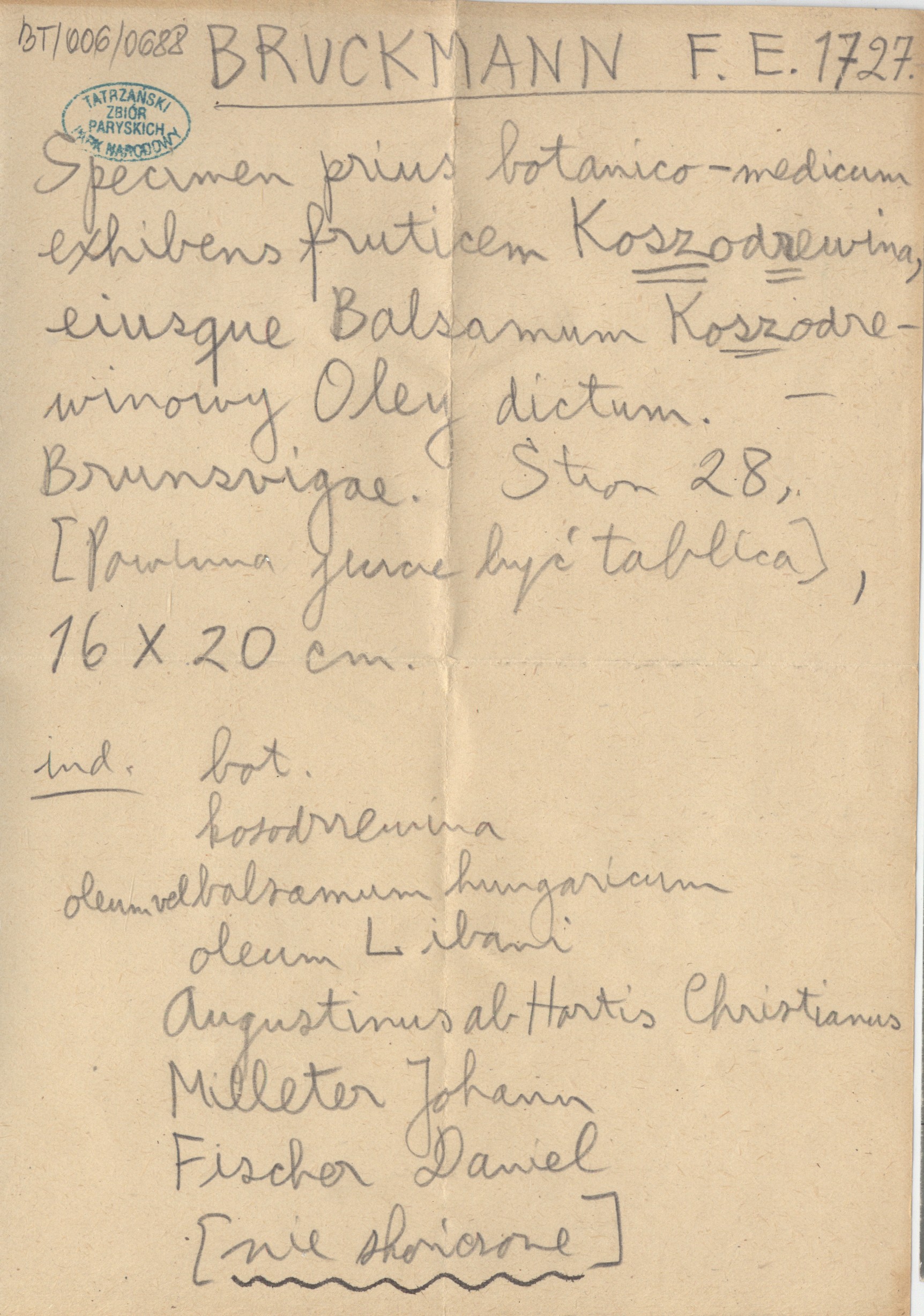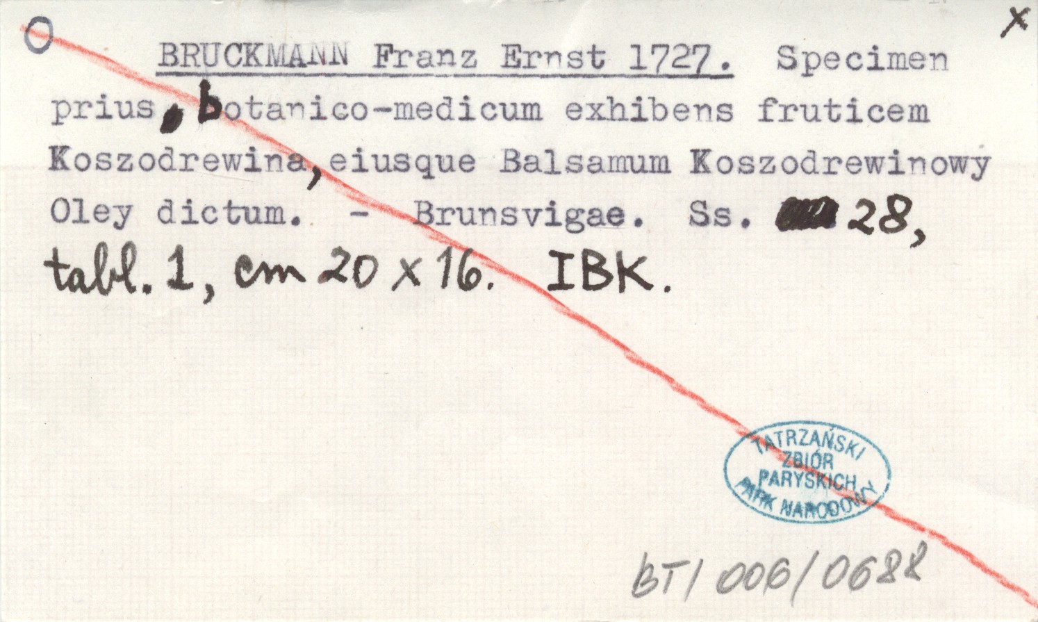 BRUCKMANN Franz Ernst 1727 Specimen prius botanico-medicum exhibens fruticem Koszodrewina, eiusque Balsamum Koszodrewinowy Oley dictum.