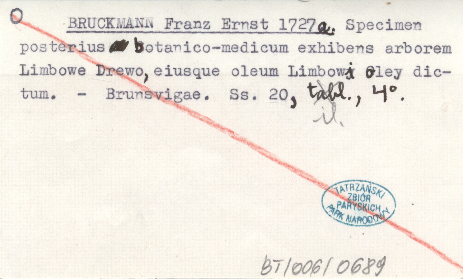 BRUCKMANN Franz Ernst 1727 a Specimen prius botanico-medicum exhibens arborem Limbowe Drewo, eiusque oleum Limbowi Oley dictum.