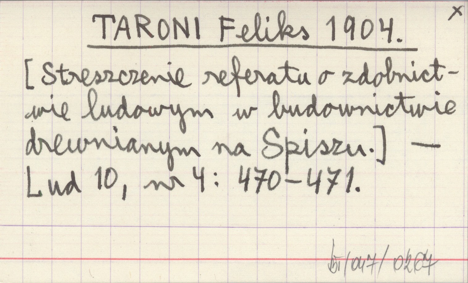 TARONI Feliks 1904 [Streszczenie referatu o zdobnictwie ludowym w budownictwie drewnianym na Spiszu.]