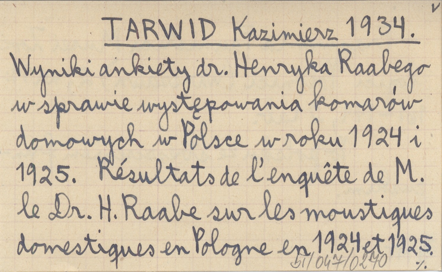 TARWID Kazimierz 1934 Wyniki ankiety dr. Henryka Raabego w sprawie występowania komarów domowych w Polsce w roku 1924 i 1925. Résultats de l'enquete de M. le Dr. H. Raabe sur les moustiques domestiques en Pologne en 1924 et 1925.