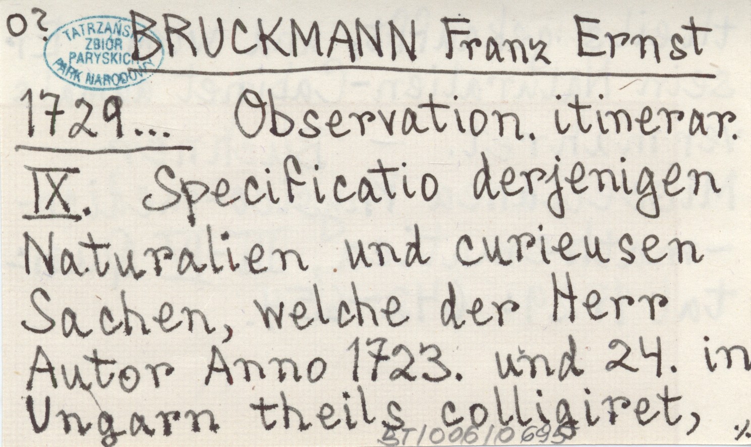 BRUCKMANN Franz Ernst 1729... Observation. itinerar. IX. Specificatio derjenigen Naturalien und curieusen Sachen, welche der Herr Autor Anno 1723. und 24. in Ungarn theils colligiret, theils gekaufft, und womit Er sein Naturalien-Cabinet damals vermahret.
