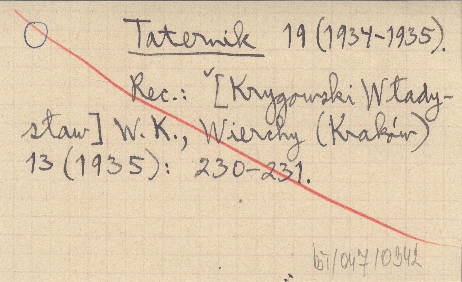 Taternik, 19 (1934-1935). REC: [KRYGOWSKI Władysław] W. K., Wierchy (Kraków) 13 (1935): 230-231.