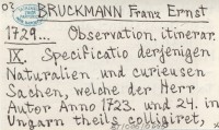 BRUCKMANN Franz Ernst 1729... Observation. itinerar. IX. Specificatio derjenigen Naturalien und curieusen Sachen, welche der Herr Autor Anno 1723. und 24. in Ungarn theils colligiret, theils gekaufft, und womit Er sein Naturalien-Cabinet damals vermahret.