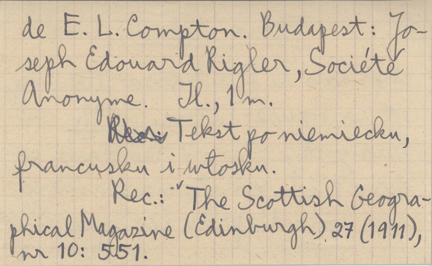 Budapest , Avec 7 tableaux coloriés et vingt-six gravures sur bois d'aprés les aquarelles de E. L. Compton. Budapest: Joseph Edouard Rigler, Société Anonyme. Il., 1 mapa. Tekst po niemiecku, francusku i włosku. REC: The Scottish Geographical Magazine (Edinburgh) 27 (1911), nr 10: 551.