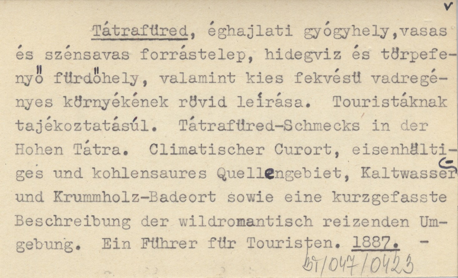Tátrafüred, éghajlati gyógyhely, vasas és szénsavas forrástelep, hidegviz és törpefenyő fürdőhely, valamint kies fekvésü vadregényes környékének rövid leírása. Touristáknak tajékoztatásúl. Tátrafüred-Schmecks in der Hohen Tátra. Climatischer Curort, eisenhältiges und kohlensaures Quellengebiet, Kaltwasser- und Krummholz-Badeort sowie eine kurzgefasste Beschreibung der wildromantisch reizenden Umgebung. Ein Führer für Touristen. 1887