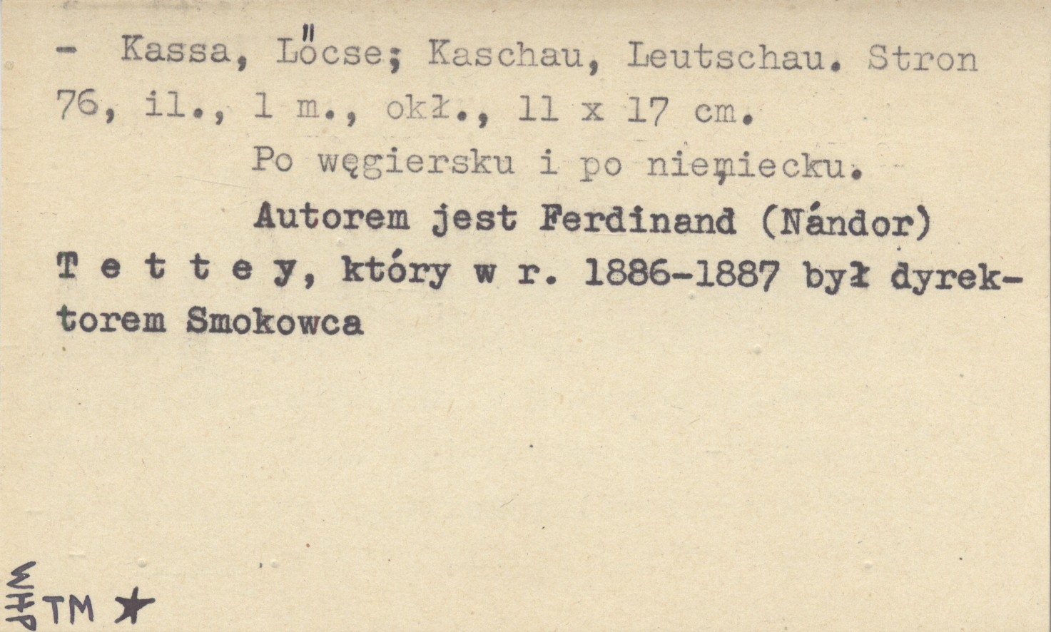 Kassa ; Lőcse ; , 76 s., il., 1 mapa, okł., 11x17 cm. Autorem jest Ferdinand (Nándor) Tettey, który w r. 1886-1887 był dyrektorem Smokowca.