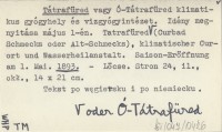 Tátrafüred vagy Ó-Tátrafüred klimatikus gyógyhely és vizgyógyintézet. Idény megnyitása május l-én. Tátrafüred oder Ó-Tátrafüred (Curbad Schmecks oder Alt-Schmecks), klimatischer Curort und Wasserheilanstalt. Saison-Eröffnung am 1. Mai. 1893