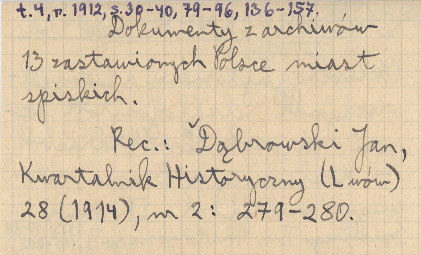Közlemenyek Szepes vármegye multjából [Rocznik Spiskiego Towarzystwa Historycznego], T. 4, r. 1912: 30-40, 79-96, 136-157 ; 1913: 77-88, 195-203. Dokumenty z archiwów 13 zastawionych Polsce miast spiskich. REC: DˇBROWSKI Jan, Kwartalnik Historyczny (Lwów) 28 (1914), nr 2: 279-280.