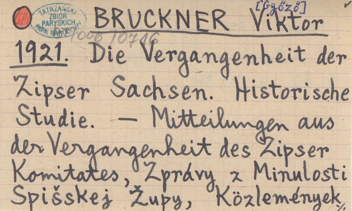 BRUCKNER Győző 1921 Die Vergangenheit der Zipser Sachsen. Historische Studie. Mitteilungen aus der Vergangenheit des Zipser Komitates, Zprávy z Minulosti Spiąskej ®upy.