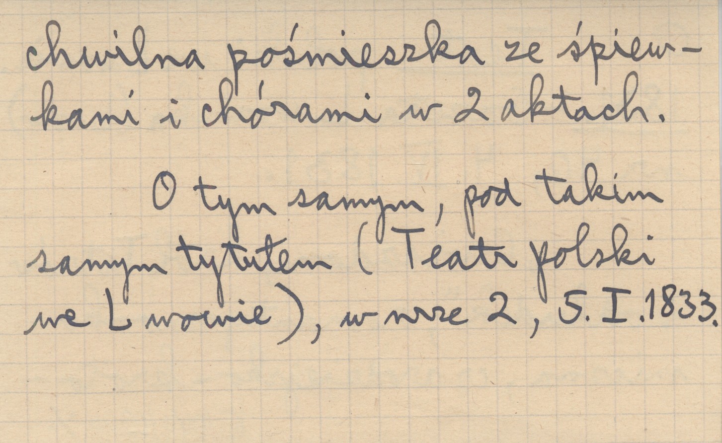 Gazeta Lwowska (Lwów) , Nr 40 (4 IV 1831). "Gwiazdon, król Tatrów i odludek", romantyczno-komiczna, czarodziejsko-krotochwilna pośmieszka ze śpiewkami i chórami w 2 aktach. O tym samym, pod tym samym tytułem (Teatr polski we Lwowie), w nr 2 (5 I 1833).