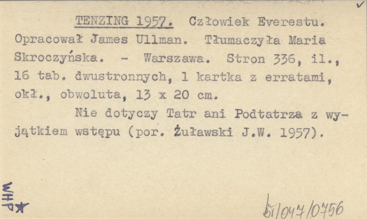 Warszawa , 336 s., il., 16 k., err., okł., obw., 13x20 cm. Nie dotyczy Tatr ani Podtatrza z wyjątkiem wstępu (por. Żuławski J. W. 1957). Opracował James Ullman. Tłumaczyła Maria Skroczyńska.