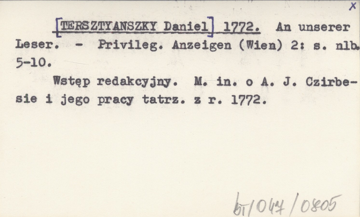 Privilegirte Anzeigen (Wien) , 2: [5]-[10]. Wstęp redakcyjny. M. in. o A. J. Czirbesie i jego pracy tatrzańskiej z r. 1772.