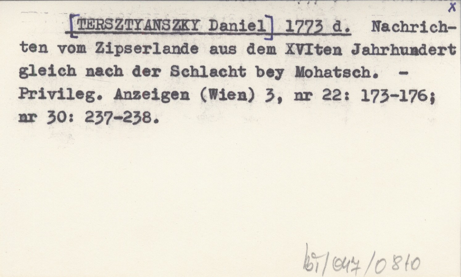 [TERSZTYANSZKY Daniel] 1773 d Nachrichten vom Zipserlande aus dem XVIten Jahrhundert gleich nach der Schlacht bey Mohatsch.