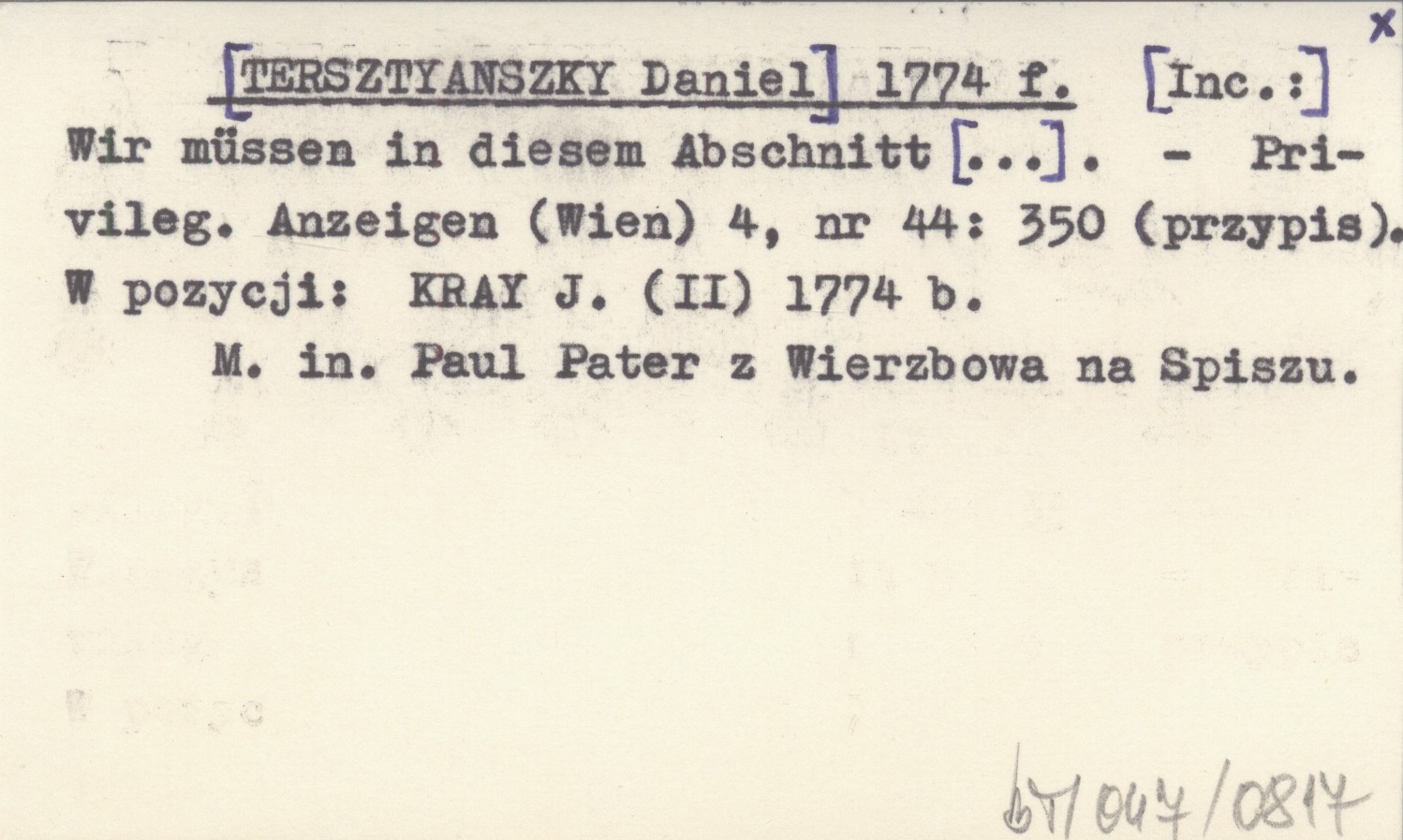 KRAY J. (II) 1774 b Privilegirte Anzeigen (Wien) , 4, nr 44: 350. M. in. Paul Pater z Wierzbowa na Spiszu.