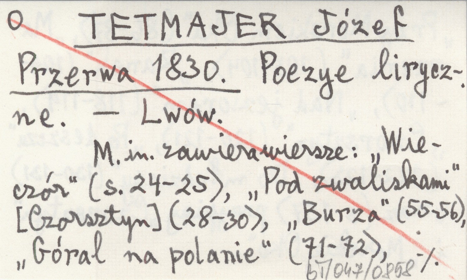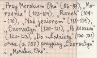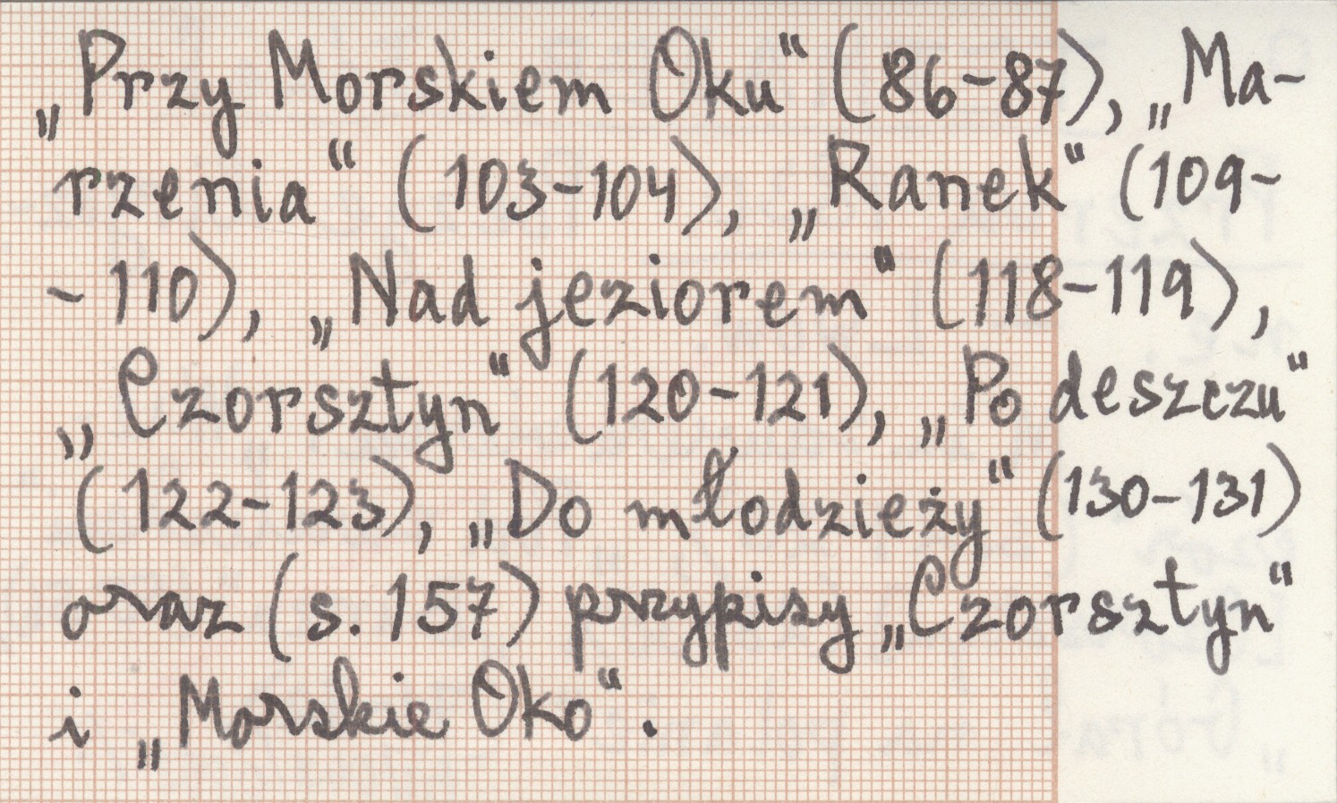 Lwów , M. in. zawiera wiersze: "Wieczór" (s. 24-25), "Pod zwaliskami" [Czorsztyn] (s. 28-30), "Burza" (s. 55-56), "Góral a polanie" (s. 71-72), "Przy Morskiem Oku" (s. 86-87), "Marzenia" (s. 103-104), "Ranek" (s. 109-110), "Nad jeziorem" (s. 118-119), "Czorsztyn" (s. 120-121), "Po deszczu" (s. 122-123), "Do młodzieży" (s. 130-131) oraz (s. 157) przypisy "Czorsztyn" i "Morskie Oko".