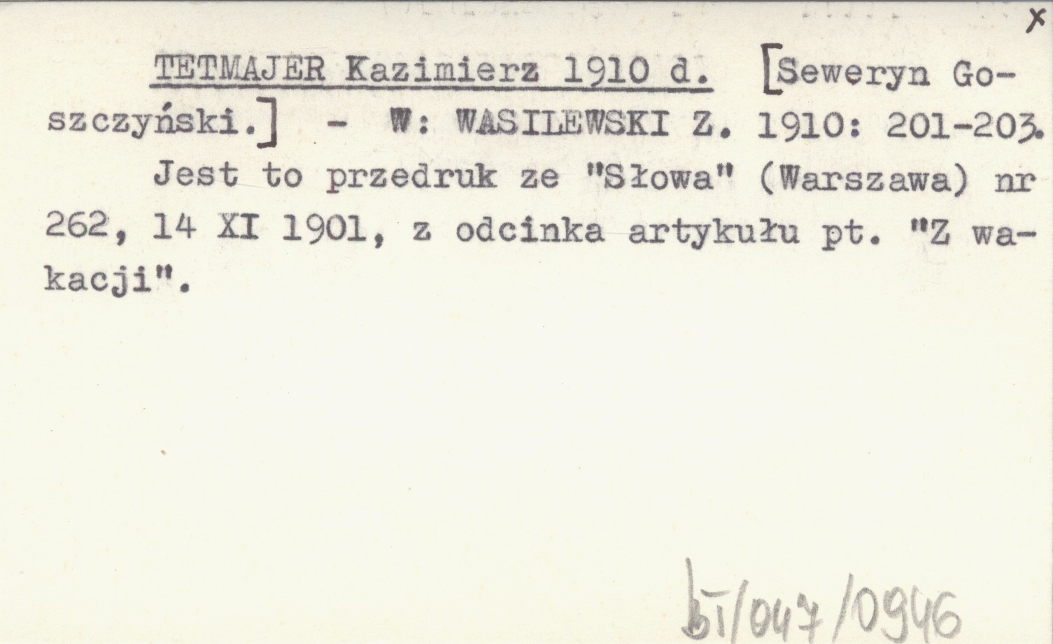 WASILEWSKI Z. 1910 , S. 201-203. Jest to przedruk ze "Słowa" (Warszawa) nr 262 (14 XI 1901), z odcinka artykułu pt. "Z wakacji".