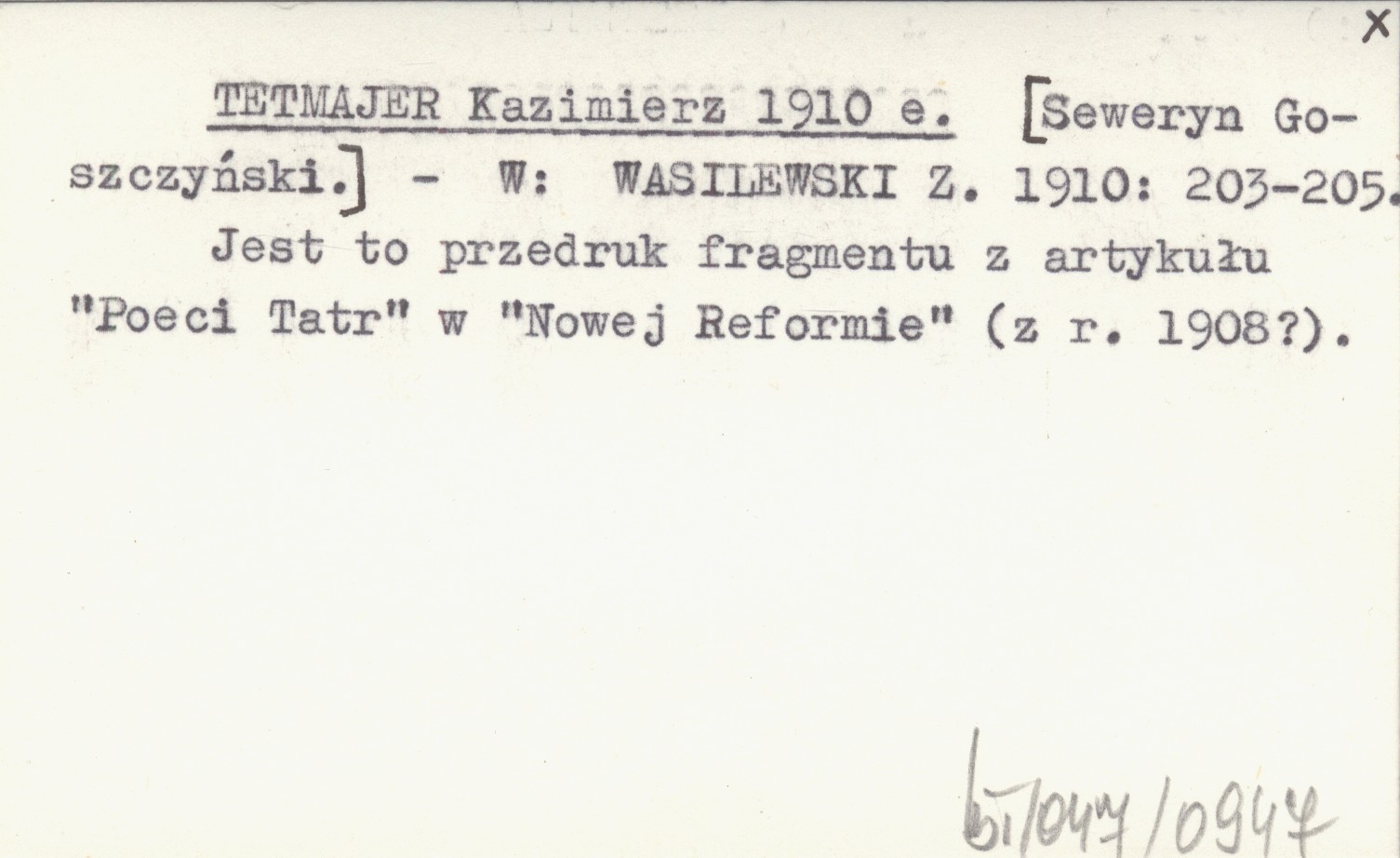 WASILEWSKI Z. 1910 , S. 203-205. Jest to przedruk fragmentu z artykułu "Poeci Tatr" w "Nowej Reformie" (z r. 1908?).