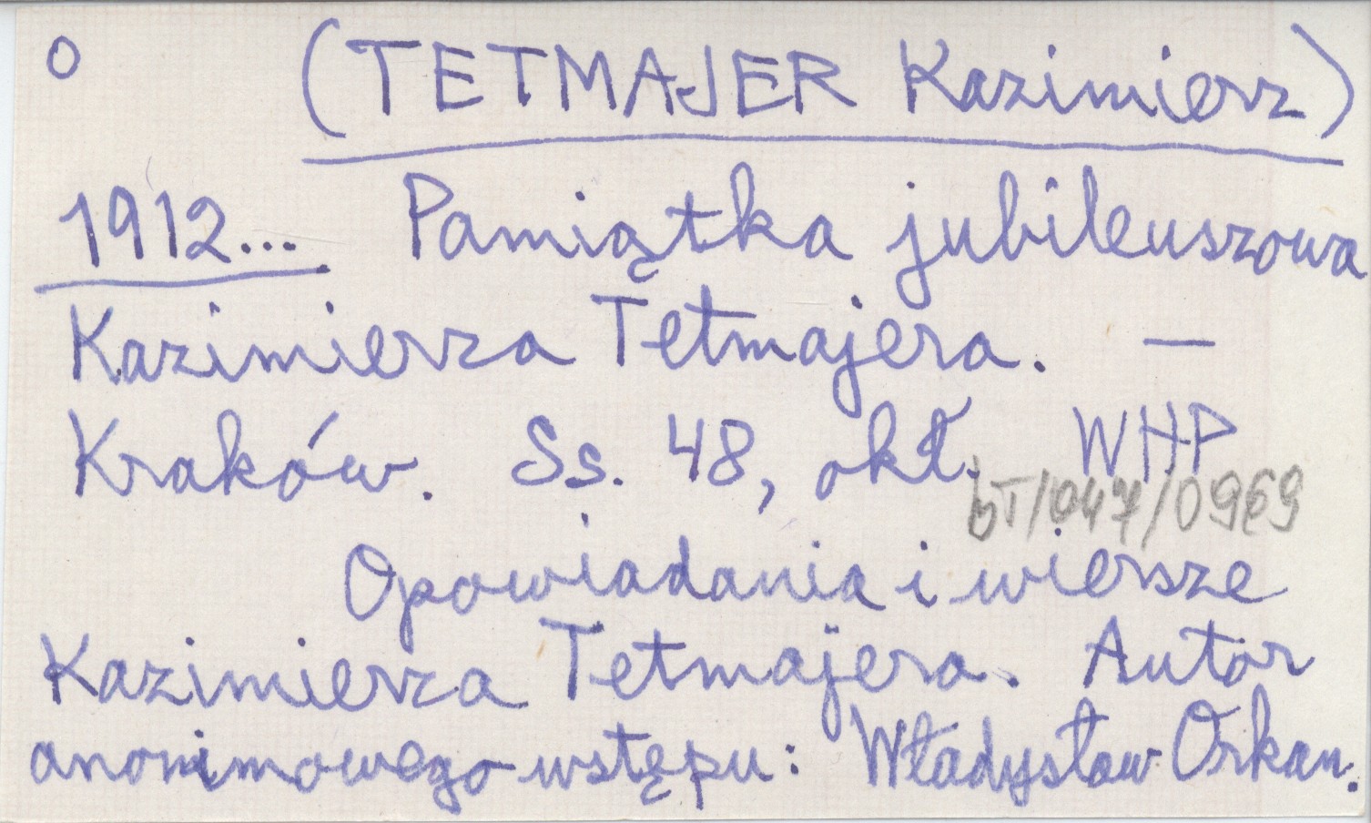 Kraków , 48 s., okł. Opowiadania i wiersze Kazimierza Tetmajera. Autor anonimowego wstępu: Władysław Orkan.