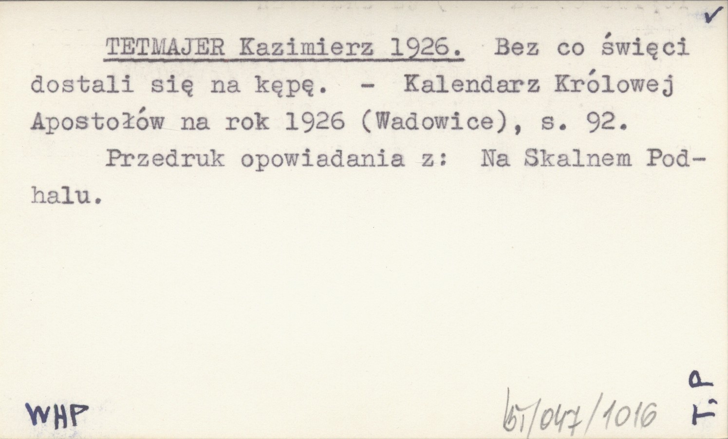 Kalendarz Królowej Apostołów na rok 1926 (Wadowice) , S. 92. Przedruk opowiadania z: Na Skalnem Podhalu.