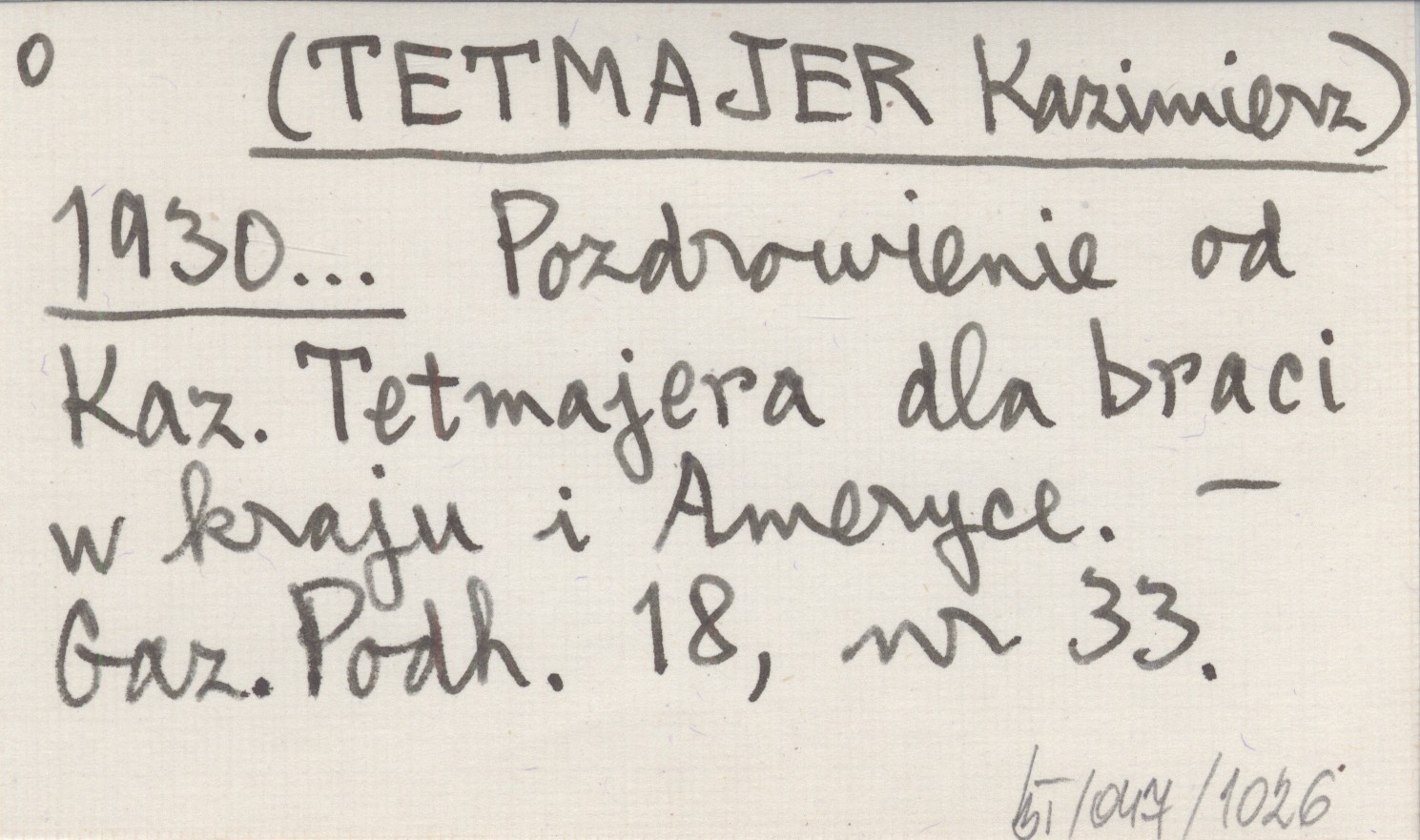 [TETMAJER Kazimierz] 1930... Pozdrowienia od Kaz. Tetmajera dla braci w kraju i Ameryce.