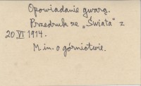 Ziemia Podhalańska, 2, nr 11. Opowiadanie gwarą. M. in. o górnictwie. Przedruk ze "Świata" z 20 VI 1914.