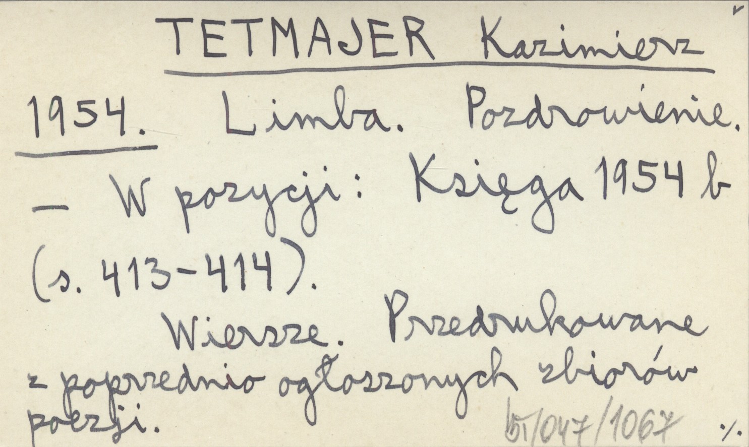Księga 1954 b , S. 413-414. Wiersze. Przedrukowane z poprzedniego ogłoszonych zbiorów poezji.