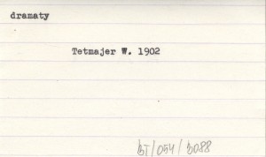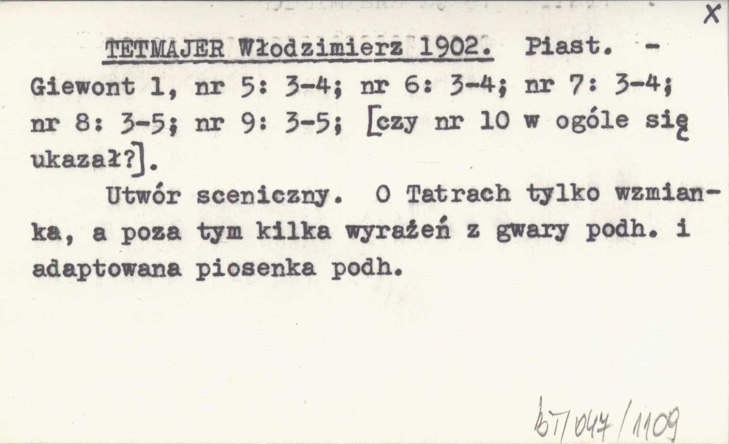 Giewont, 1, nr 5: 3-4 ; nr 6: 3-4 ; nr 7: 3-4 ; nr 8: 3-5 ; nr 9: 3-5. Utwór sceniczny. O Tatrach tylko wzmianka, a poza tym kilka wyrażeń z gwary podhalańskiej i adaptowana piosenka podhalańska. [Czy nr 10 w ogóle się ukazał?]