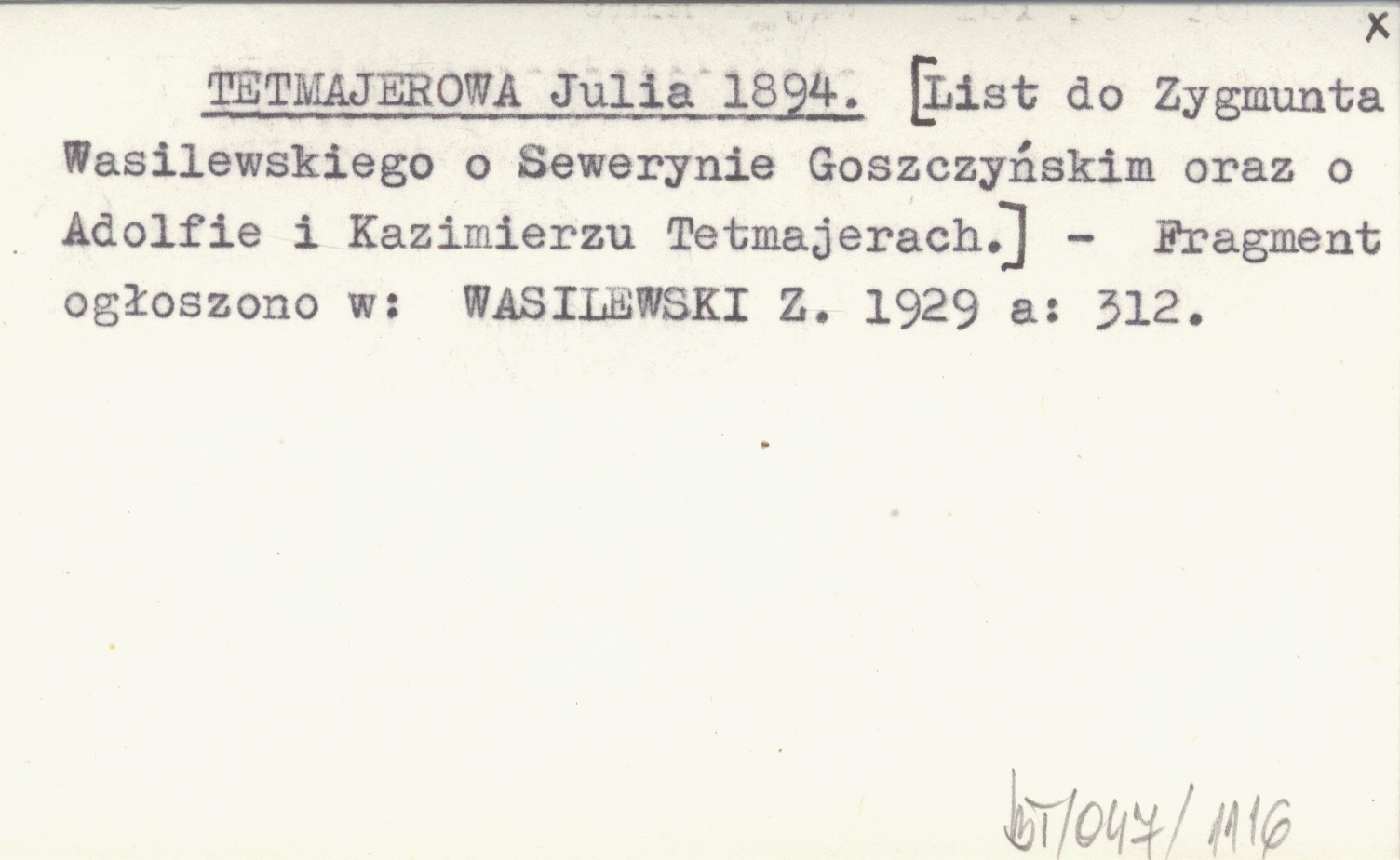 TETMAJEROWA Julia 1894 [List do Zygmunta Wasilewskiego o Sewerynie Goszczyńskim oraz o Adolfie i Kazimierzu Tetmajerach.]