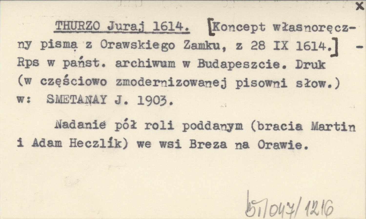 , Nadanie pół roli poddanym (bracia Martin i Adam Heczlík) we wsi Breza na Orawie. Rękopis w państwowym archiwum w Budapeszcie. Druk (w częściowo zmodernizowanej pisowni słowackiej) w: SMETANAY J. 1903.