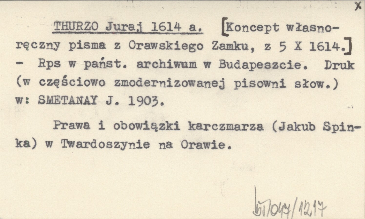 , Prawa i obowiązki karczmarza (Jakub Spinka) w Twardoszynie na Orawie. Rękopis w państwowym archiwum w Budapeszcie. Druk (w częściowo zmodernizowanej pisowni słowackiej) w: SMETANAY J. 1903.