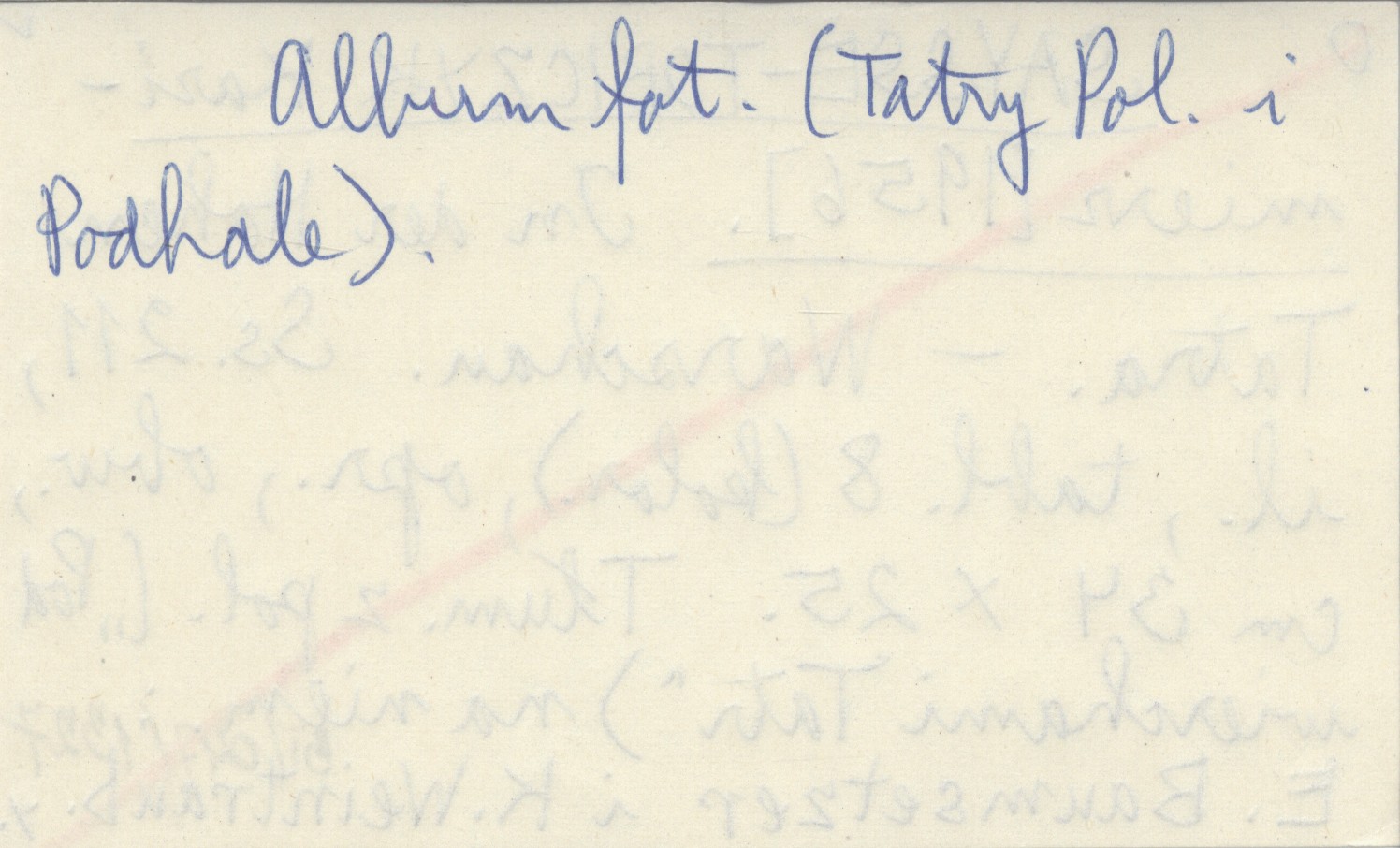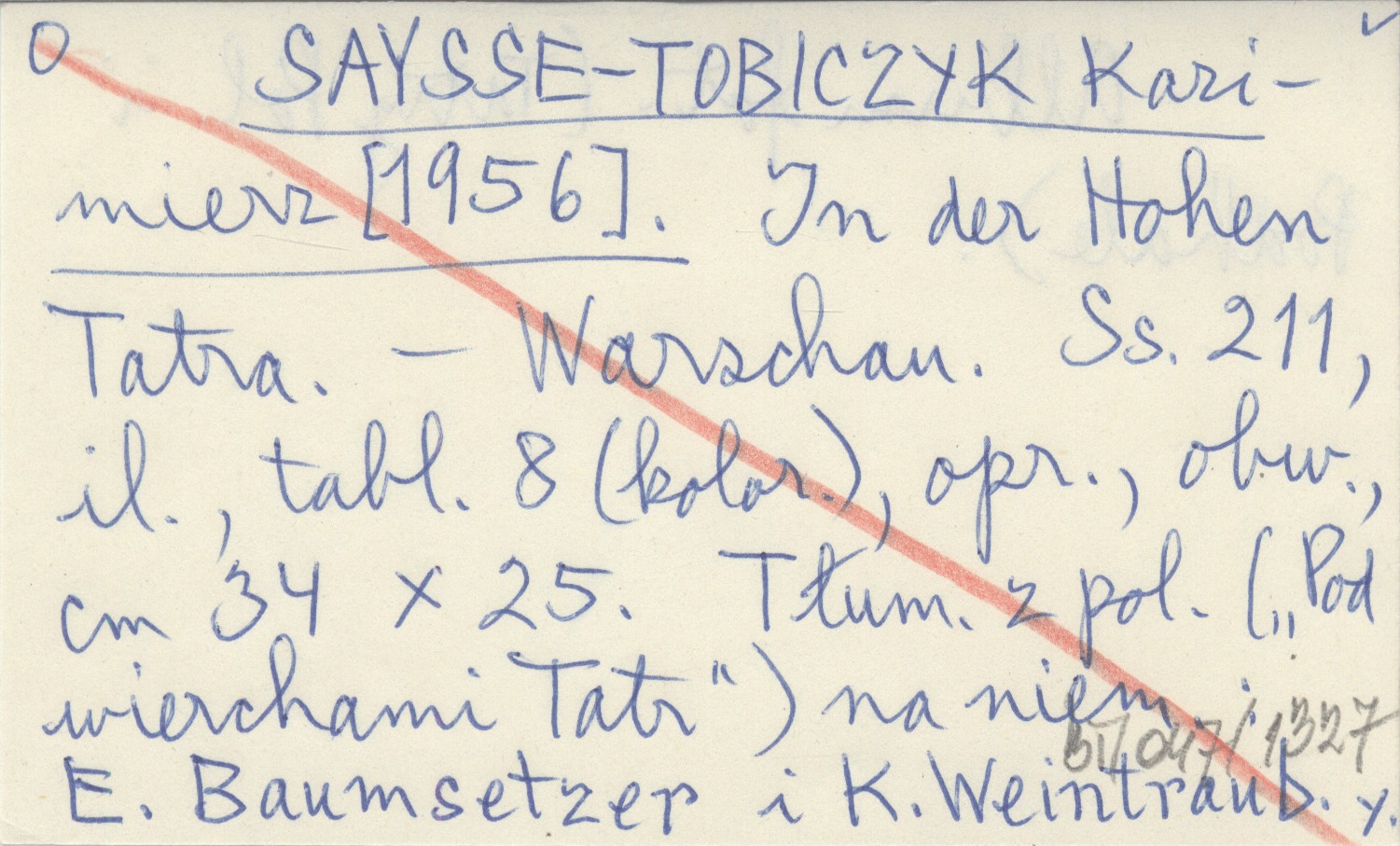 Warschau , 211 s., il., 8 k., opr., obw., 25x34 cm. Album fotograficzny (Tatry Polskie i Podhale). Übertragung ins Deutsche E. Baumsetzer und K. Weintraub. Jest to przekład z polskiego na niemiecki pozycji: TOBICZYK K. S. 1956. Zarówno w tekście jak i w ilustracjach są różnice.