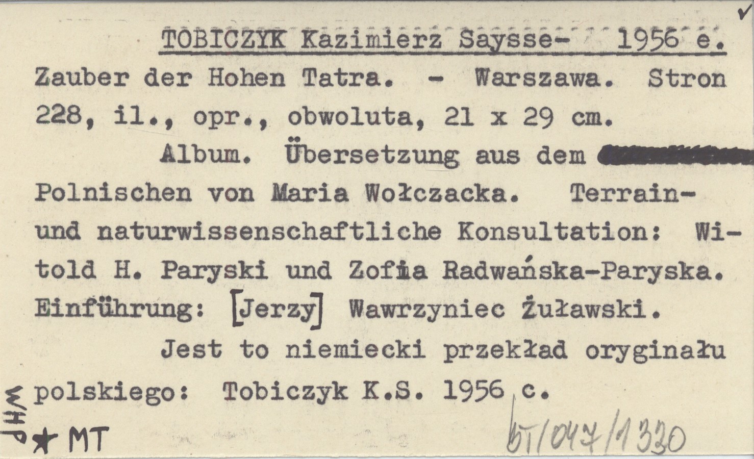 Warszawa , 228 s., il., opr., obw., 21x29 cm. Album. Übersetzung aus dem Polnischen von Maria Wołczacka. Terrain- und naturwissenschaftliche Konsultation: Witold H. Paryski und Zofia Radwańska-Paryska. Einführung: [Jerzy] Wawrzyniec Żuławski. Jest to niemiecki przekład oryginału polskiego: TOBICZYK K. S. 1956 c.